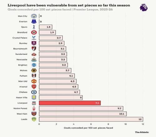 相比之下,周日是他们本赛季第5次在70次定位球防守中失球——只有诺丁汉森林(6次)、利兹联(6次)和西汉姆联(8次)丢得更多。