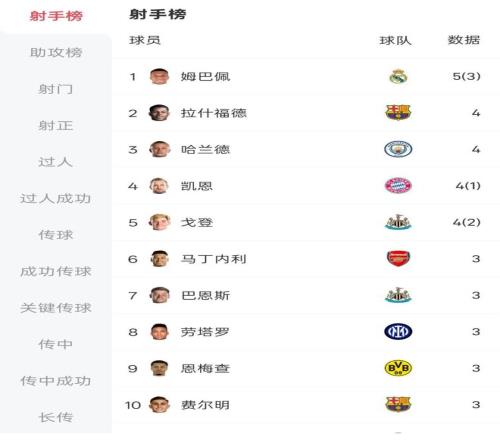 雷速体育10月22日报道宣称 北京时间今日,欧冠单夜九场精彩纷呈的比赛落幕,欧冠的射手榜也有所变动,拉什福德来到了第二,姆巴佩依旧五球居首。