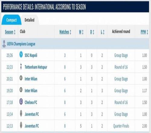 据统计,这是孔蒂带队的第45场欧冠联赛,他共计取得16胜14平15负,胜率为35.6%,场均可以拿到1.38分。