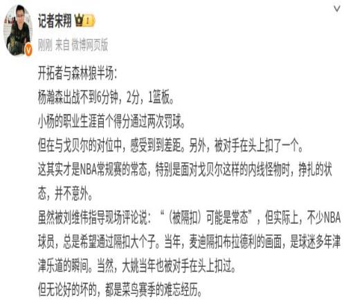 雷速体育10月23日报道宣称 今日NBA常规赛,开拓者对阵森林狼,杨瀚森迎来常规赛首秀,对他的表现,记者宋翔发文表示,杨瀚森在与戈贝尔的对位中感受到差距,这才是NBA常规赛的常态。