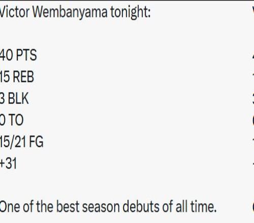 首先,文班成为了NBA历史上第6个赛季首战砍下至少40分15篮板的球员,前5个是张伯伦、卡尔-马龙、浓眉、沃尔特-贝拉米和埃尔金-贝勒。