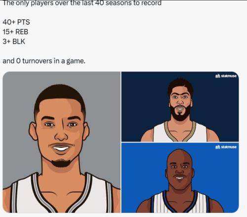 第二,文班亚马成为了历史第三位能够在单场比赛中轰下至少40分15篮板3盖帽且0失误的球员,除了他之外,还有浓眉哥和奥尼尔。