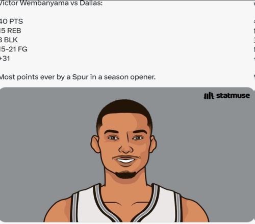 第六,文班亚马成为马刺队史第二位在赛季揭幕战中至少得到30分10板的球员,上一位是2004年的邓肯。