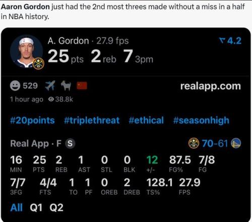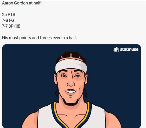 首先,在半场比赛中,戈登就8投7中,三分球7投全中轰下25分,这是他的职业生涯半场比赛中的最高得分和三分球命中最多的比赛。