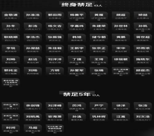 国家体育总局、公安部、中国足协联合处罚,半数球队新赛季将被扣分,73人遭终身禁赛。共13家俱乐部受惩。中超16支球队中有9支,外加中甲4支球队,因涉及多年假球、非法赌球行为遭到处罚,新赛季将被扣分。中超三连冠得主海港被扣5分,申花、浙江、国安、三镇等队都遭处罚。