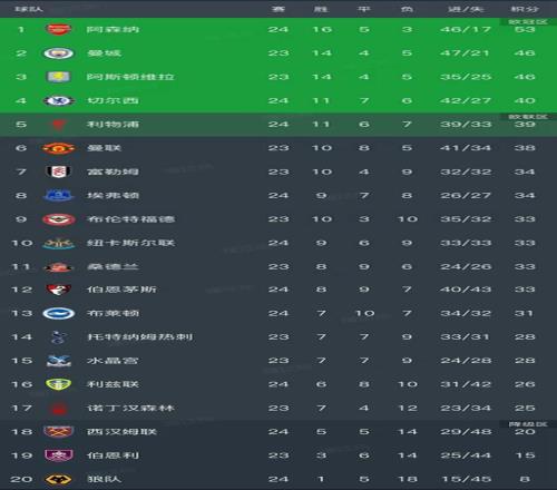 英超最新积分榜