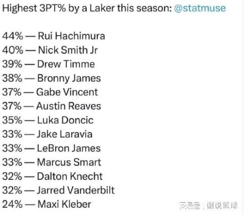 尼克-史密斯紧随其后,他因为是湖人双向球员,所以出场机会没那么多。即便如此尼克-史密斯还是数次成为奇兵,他赛季三分命中率超过4成,只是样本确实小一些。之后的提米和布朗尼-詹姆斯,三分命中率同样接近4成,只不过他们干脆是饮水机管理员了。文森特和里夫斯分列五六名,这两人倒算主要轮换,尤其里夫斯本赛季进步很大,已经朝着湖人三甚至二当家方向发展。