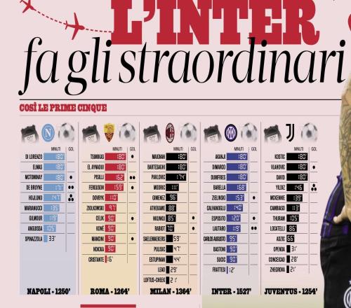 北京时间10月18日,《米兰体育报》统计了意甲目前排名前五的球队各自球员在10月国际比赛日的出场时间,国际米兰以12名球员合计1527分钟排名第一,AC米兰13名球员1364分钟第二。那